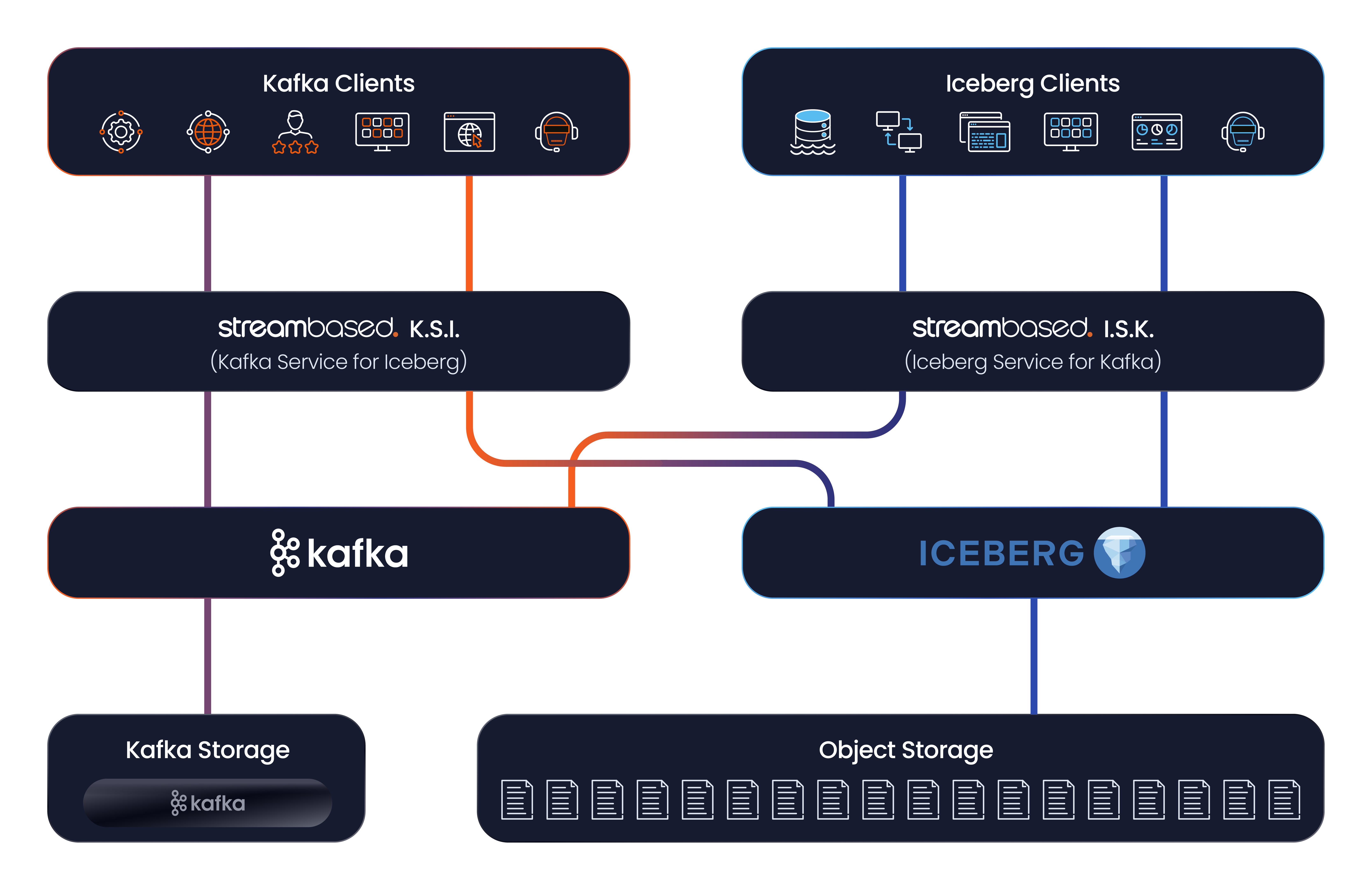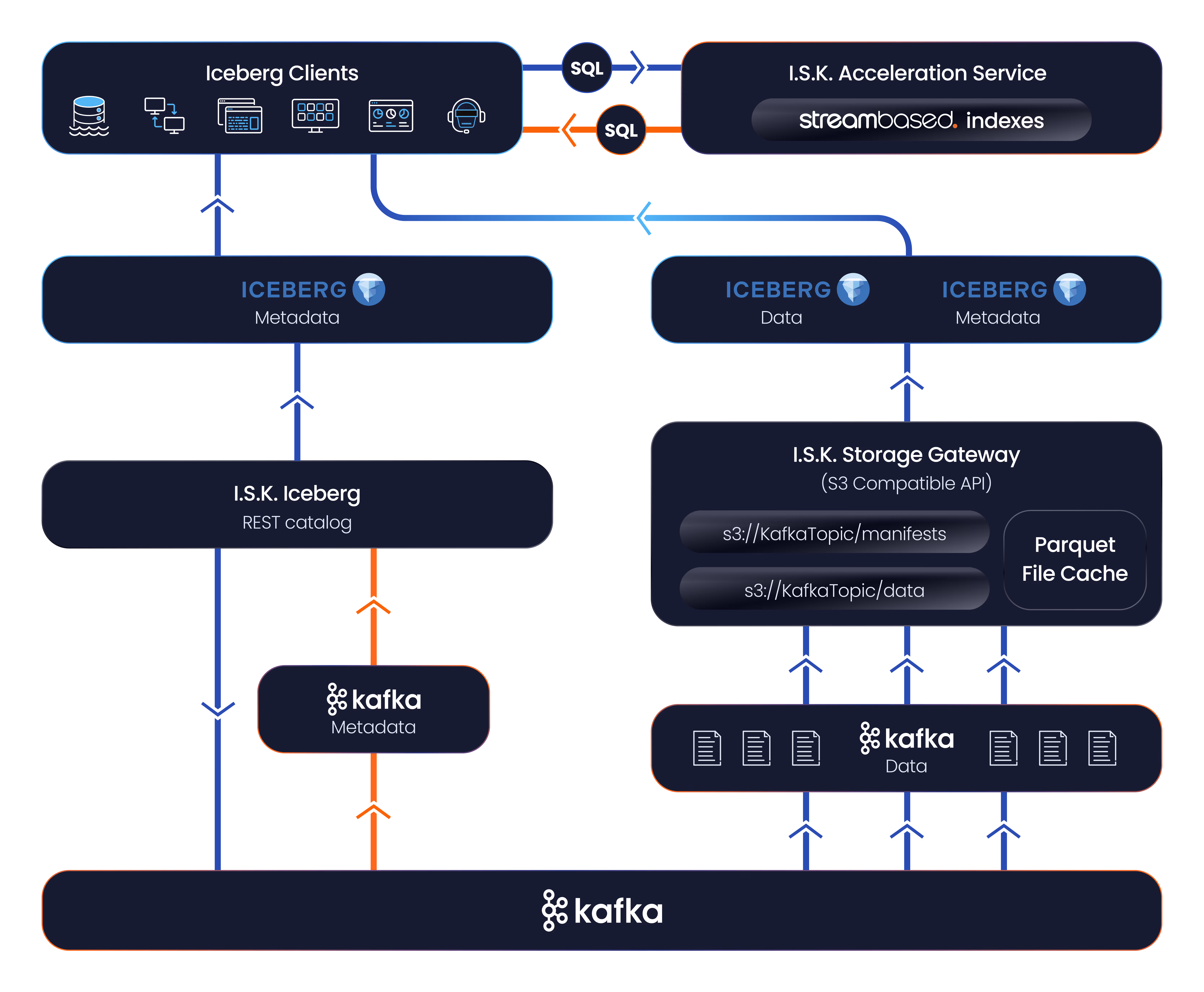 Kafka’s partition and offset concepts are mapped from columns in the Iceberg data allowing Kafka clients to interact with them as if they were Kafka topics.