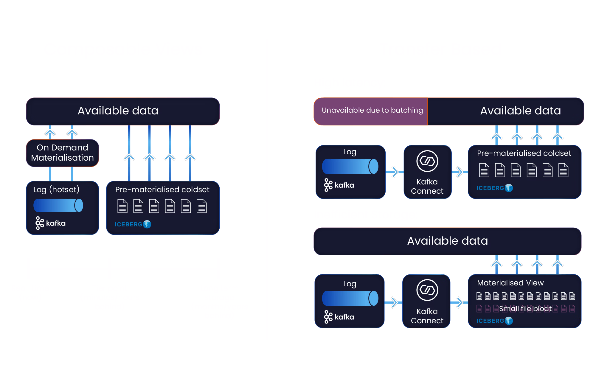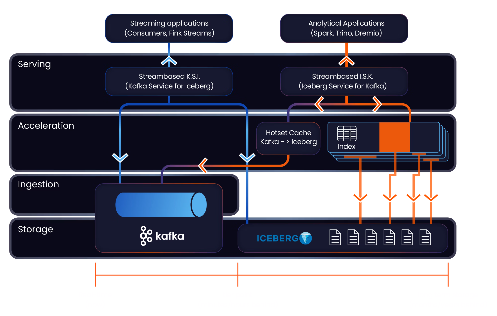 Streambased I.S.K. presents a set of Iceberg tables composed of a section of real-time data from Kafka (the “hotset“) and a section of physical Iceberg data (the “coldset“).